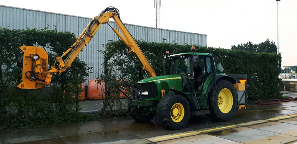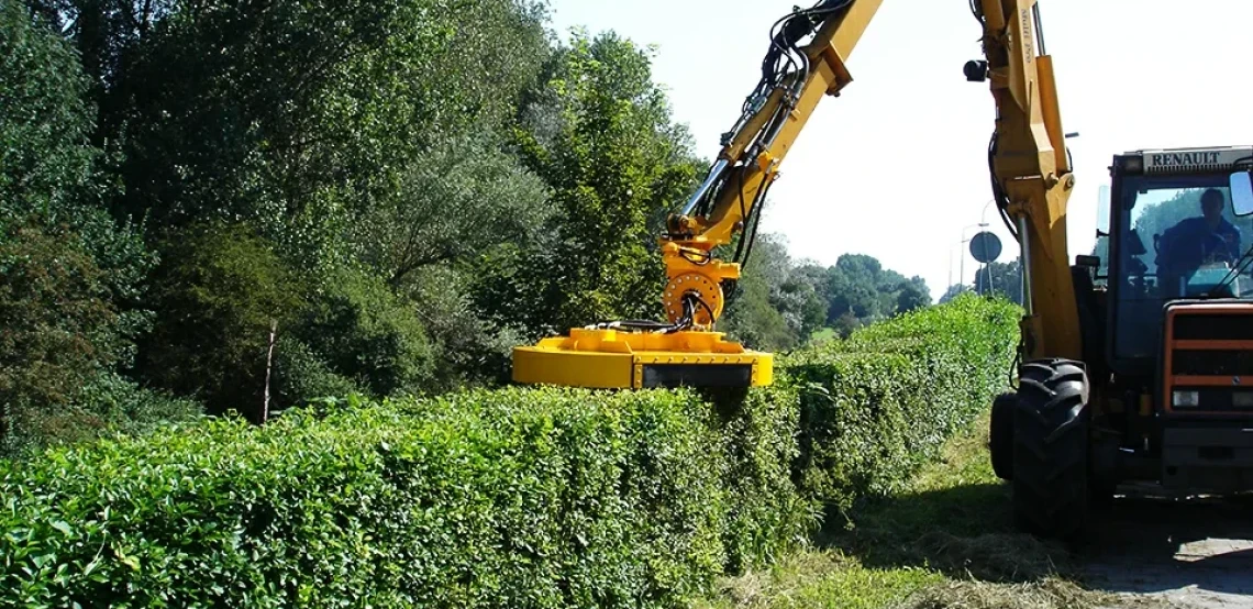 The hedge mower is suitable for mowing and pruning back the woody growth of hedges and trees with a diameter of up to 35 mm. Inside the mower body there are two mower blades, each driven by its own hydraulic motor to cut the vegetation.